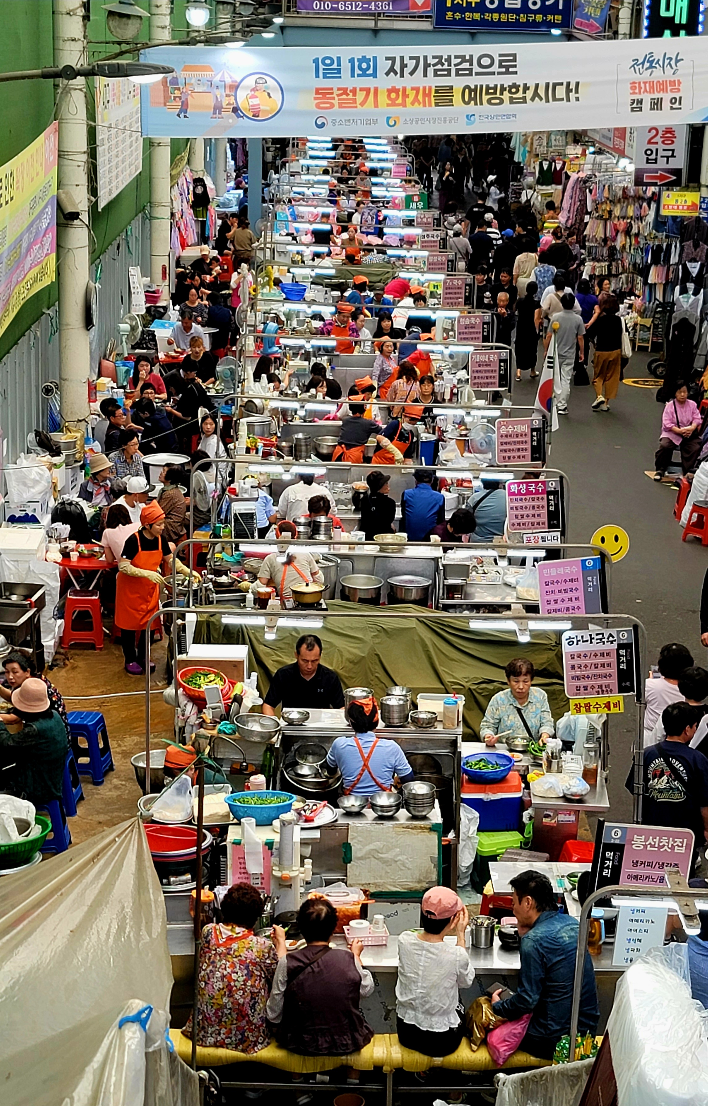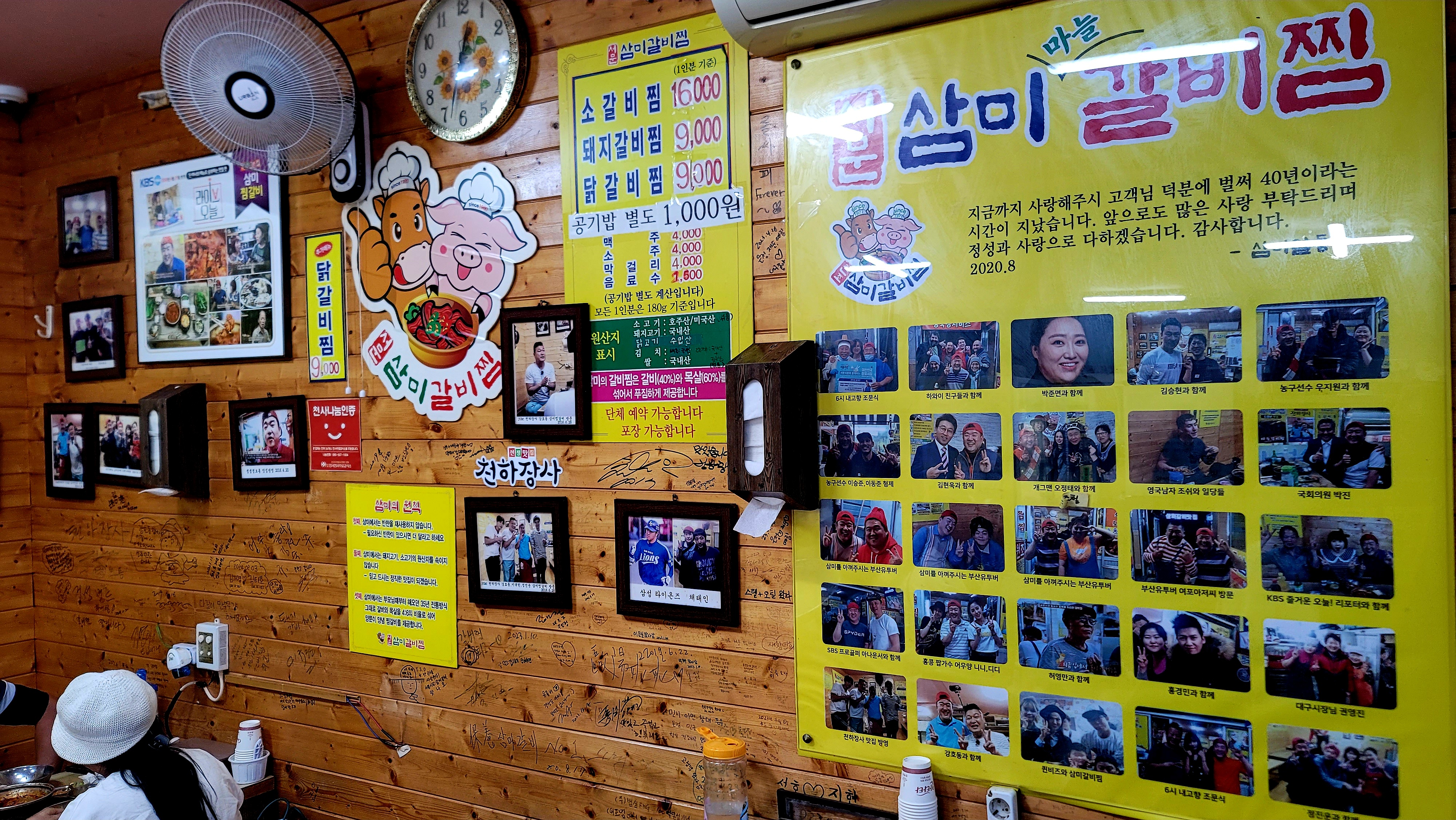시장판에는 먹을거리가 넘쳐났다. 국수, 수제비, 묵채, 호떡, 만두, 떡 등 먹거리마다 구미가 당겼다. 조금씩 다 사 먹고 싶었다. 그렇지만 집사람하고 같이 왔기에 소문난 맛집으로 안내하려고 -4지구 북쪽 명품프라자 지구 골목 안에 있는- <삼미 찜갈비> 식당에 갔다. 좁다란 식당 골목 안에 대박 맛집이 숨어 있다는 게 신기하기만 하다. 손님들이 이 집에 많이 몰리니. 장사한 지 사십여 년 넘었다지만, 시쳇말로 전생에 무슨 큰 덕을 쌓았나 보다. 식객 허영만 선생도 진작 다녀갔고 꽤 많은 연예인들도 왔다 갔다.