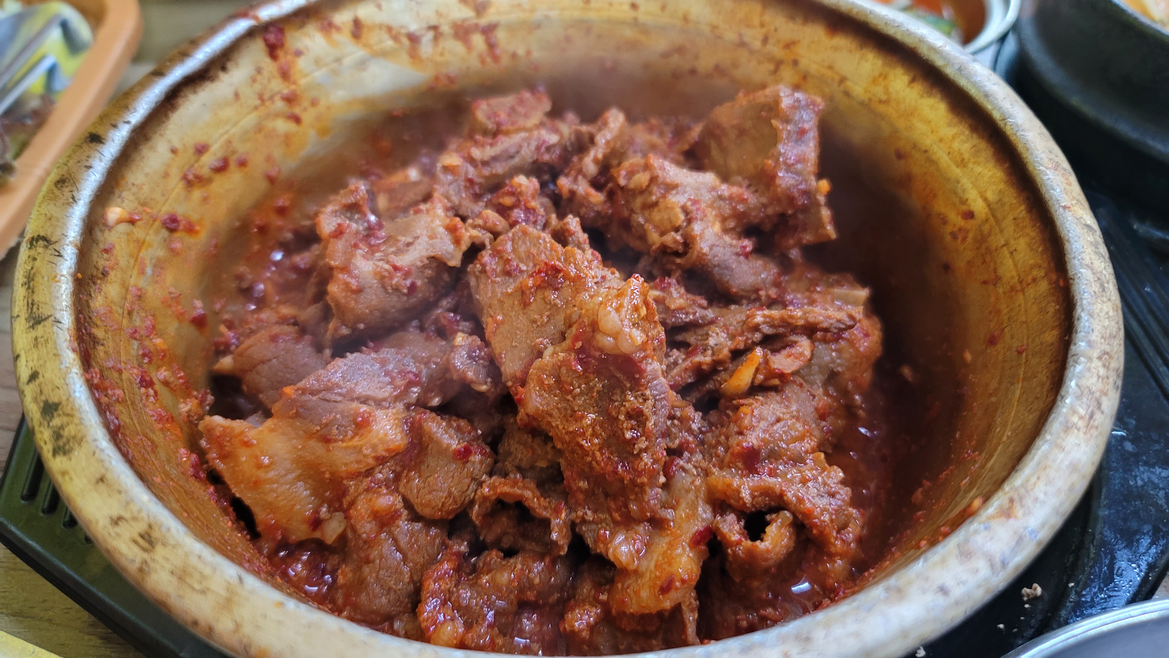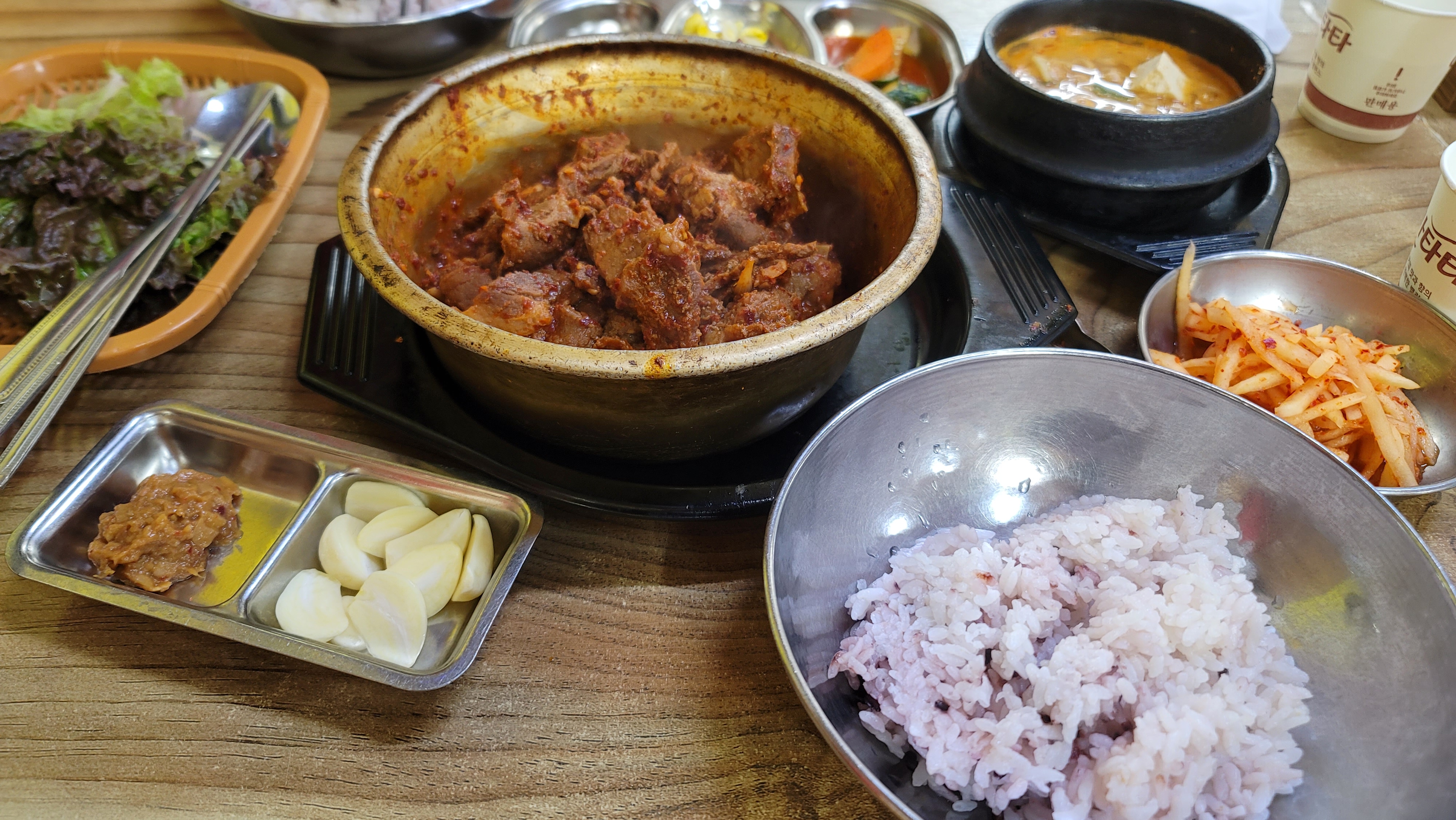 메뉴는 소갈비찜, 돼지갈비찜, 닭갈비찜 세 가지이지만, 대부분 돼지갈비를 주문했다. 양념이 잔뜩 튄 양은 그릇에 갈비찜이 나왔다. 눈치 보지 않는 서문 시장표 조리다웠다. 비빔 전용으로 청국장, 콩나물, 무채, 나물이 따라 나온다. 주인이 소개한 먹는 방법으로 '짤라가, 비비가, 쌈사가' 먹으니 맛이 기가 막힌다. 일품이었다. 공깃밥 포함 만 원의 행복이다. 집사람도 흡족해했다. 돌아올 때는 남방은 사지 않고 여름 양말 네 컬레와 녹두 과자, 홍로 사과를 한 봉지씩 샀다. (2024.9.30.)